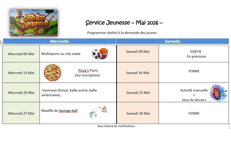 Voici le programme d'activité du service jeunesse pour le mois de mai 2026.